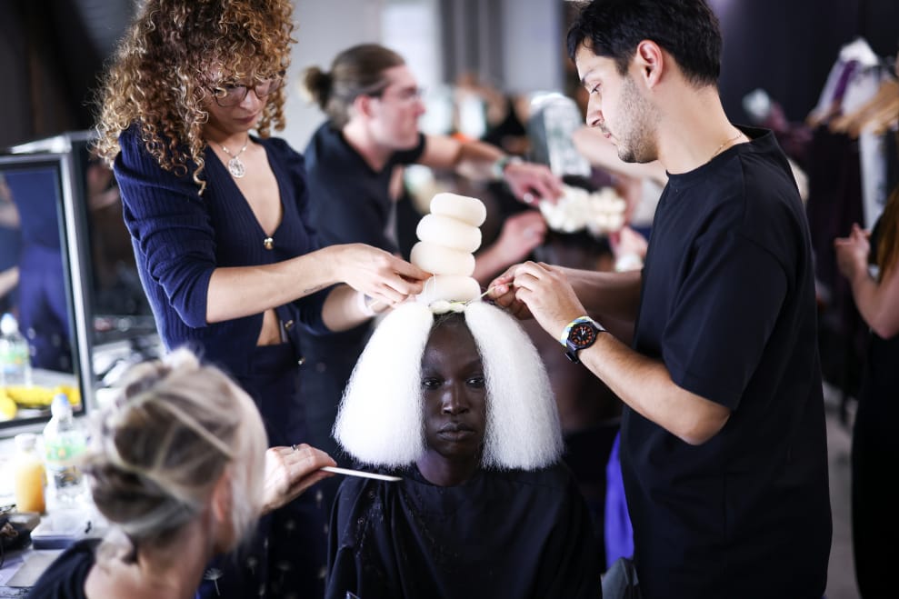 在倫敦時尚周(London Fashion Week)的一場時裝走秀開始前,造型師正於後台為即將上場的模特兒調整頭頂的髮型。