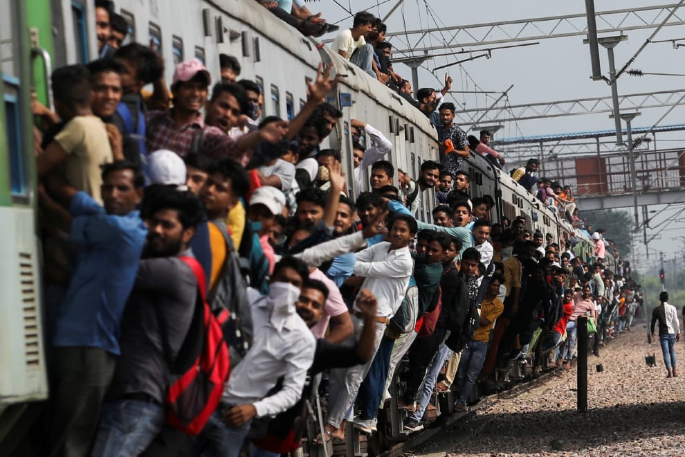 在城市加濟阿巴德(Ghaziabad),一列滿載乘客的火車正要出發,無法擠進車廂內的其他人只好攀住外頭的門窗,又或是坐在車廂的頂部。