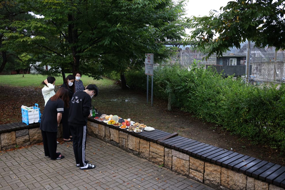 中秋節這天,一個南韓家庭來到了比鄰北韓的坡州市(Paju),他們站在分隔兩韓的非軍事區附近,透過鐵絲網望向北方,並帶上了豐盛的菜餚,好為自己位於彼端的祖先祭祖。