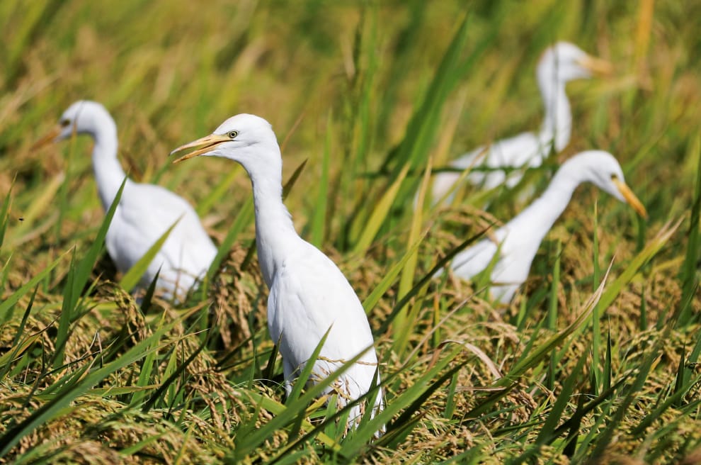 在東北部的東部省(Al-Sharkia),數隻黃頭鷺(Cattle egrets)正悠哉地漫步於金黃色的稻穗之間。最近是當地的採收季節,農夫們紛紛忙著收穫自己細心培育多時的稻米。