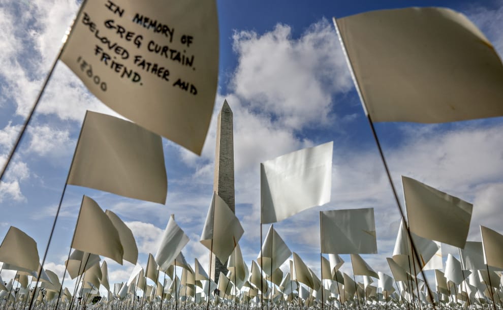 在華盛頓特區(Washington DC),象徵著COVID-19逝者的 60萬面白色旗幟,被陳列在國家廣場(National Mall)中,以表達對他們的感念與愛。畫面左上方的旗幟寫著「紀念葛瑞格·柯坦(Greg Curtain),親愛的父親與朋友」。