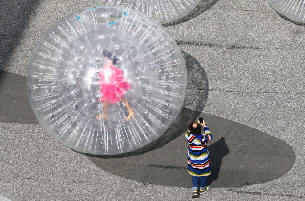 畫面中,其中一名參與演出的藝術家正走在透明的大球裡,表現出哭泣時眼淚流動的模樣。