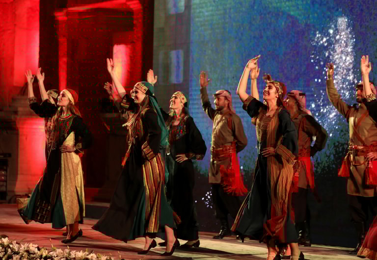 在古城傑拉什(Jerash),一群穿著傳統服飾的舞者正於傑拉什文化與藝術季(Jerash Festival of Culture and Arts)的開幕儀式中進行表演。
