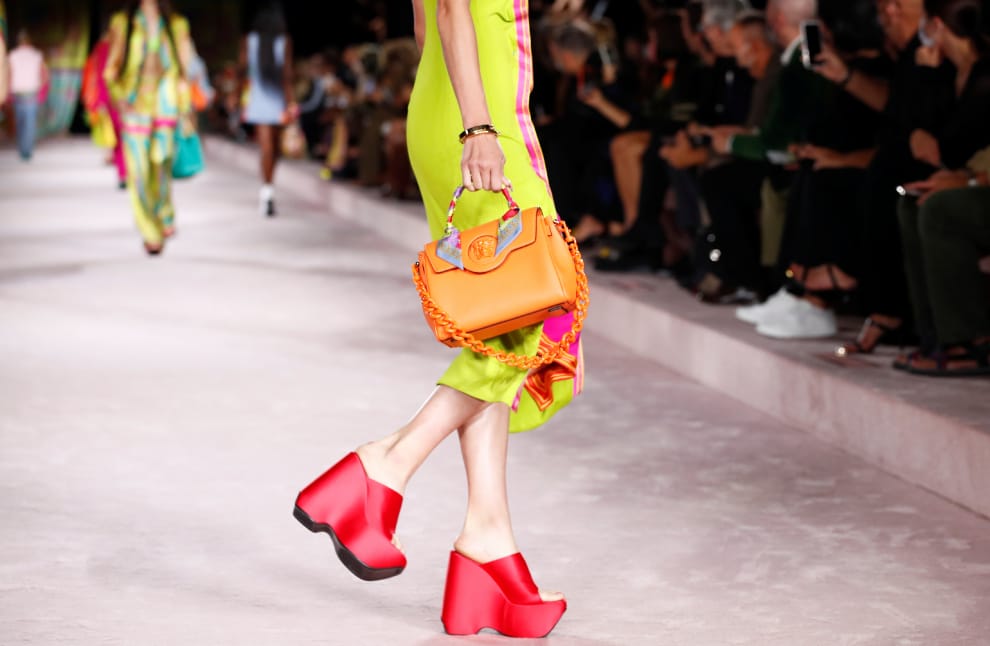 本照攝於米蘭時裝周(Milan Fashion Week),一名模特兒正於伸展台上展示義大利時裝公司凡賽斯(Versace)的 2022年春夏服裝系列。