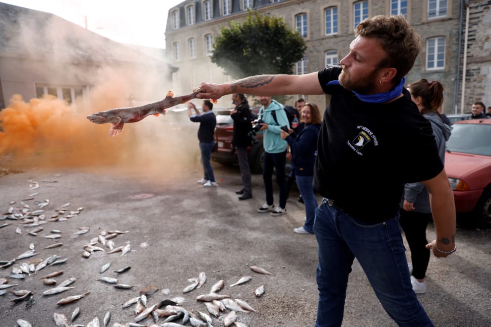 在城市瑟堡昂科唐坦(Cherbourg-en-Cotentin),為了反對離岸風力發電的設立計畫,一群漁民來到了該地區的漁業署外頭進行抗議,並在示威活動中扔擲大量死魚。