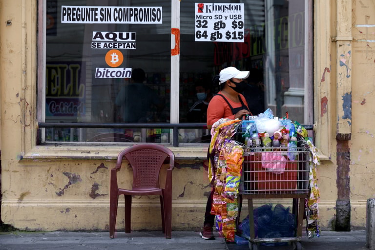 在首都聖薩爾瓦多(San Salvador),一間商店的櫥窗上掛著顯眼的標示,上頭寫著「可接受比特幣(Bitcoin)」的字樣,提醒路過的顧客這款加密貨幣是它們核可的付費方式。