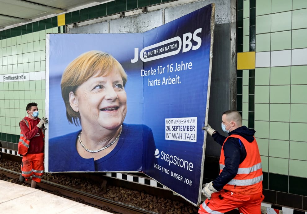 在城市漢堡(Hamburg),兩名工人正在卸下現任總理梅克爾(Angela Merkel)的廣告看板,其右上方的標語寫著「德國之母——為 16年的勤勉努力致上感謝」(Mother of Nation - Thanks For 16 Years of Hard Work)。