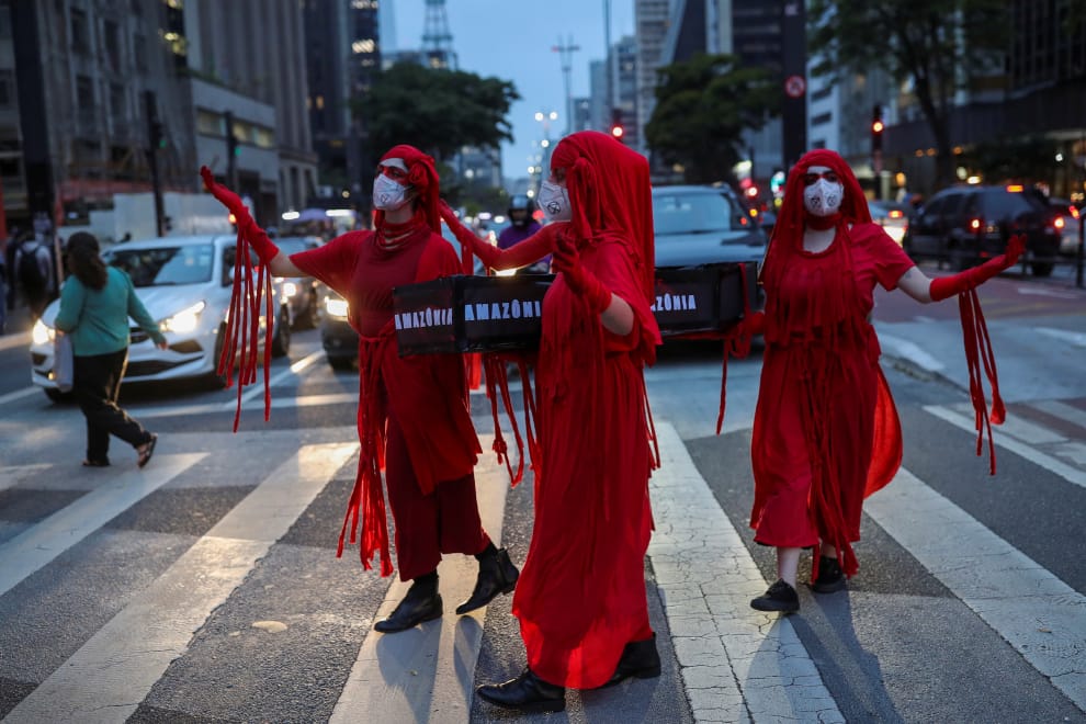 本照攝於巴西聖保羅,環保組織「反叛滅絕」(Extinction Rebellion)的成員身著紅衣,抬著裝入燃燒過的木頭與樹葉、並寫上「亞馬遜」(Amazon)的棺木,走在聖保羅人大道(Paulista Avenue)的街頭上。