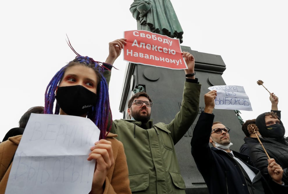 在莫斯科街頭,民眾高舉寫著「釋放納瓦爾尼」字樣的海報,要求當局盡快還反對派領袖納瓦爾尼(Alexei Navalny)自由。與此同時,他們也舉起馬桶刷反對這次的國會大選結果。