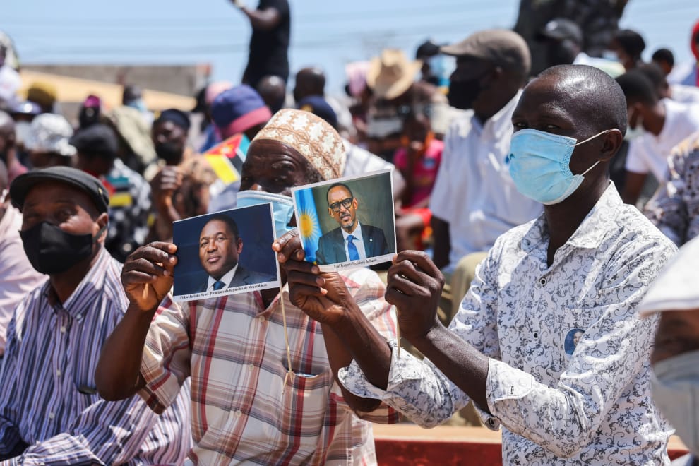 在莫三比克武裝部隊日(Armed Forces Day)這天,民眾舉起莫三比克總統紐西(Filipe Nyusi,左)和前來參訪的盧安達總統卡加米(Paul Kagame,右)的照片。