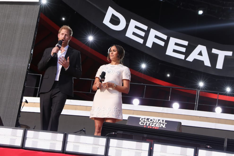 在紐約中央公園舉辦的 2021全球公民現場演唱會上,英國薩塞克斯公爵哈利(Harry)和其夫人梅根(Meghan)在舞台上演講。