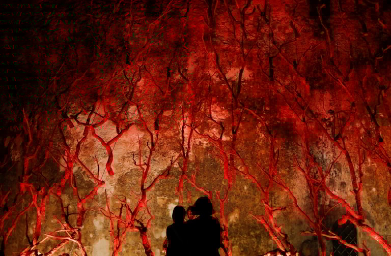 在義大利薩丁尼亞島(Sardinia)上的阿爾蓋羅小鎮(Alghero),民眾正在欣賞名為「珊瑚樹」的藝術裝置。