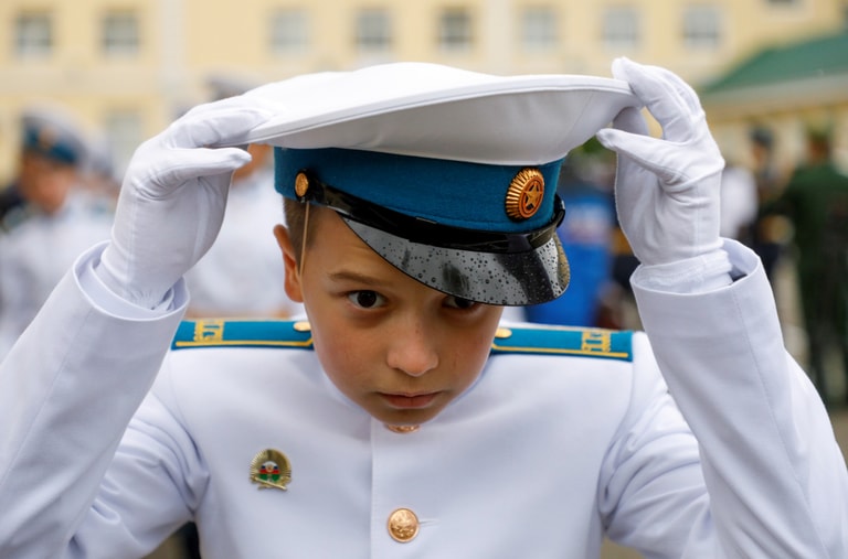 在斯塔夫羅波爾(Stavropol)的總統軍事學校,一名學員正在調整他的禮帽,準備參加學員宣誓典禮。