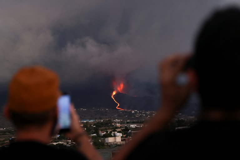 在加那利群島的第三大城拉拉古納(La Laguna),人們看著遠方流出岩漿的火山島拉帕爾馬島(La Palma)。