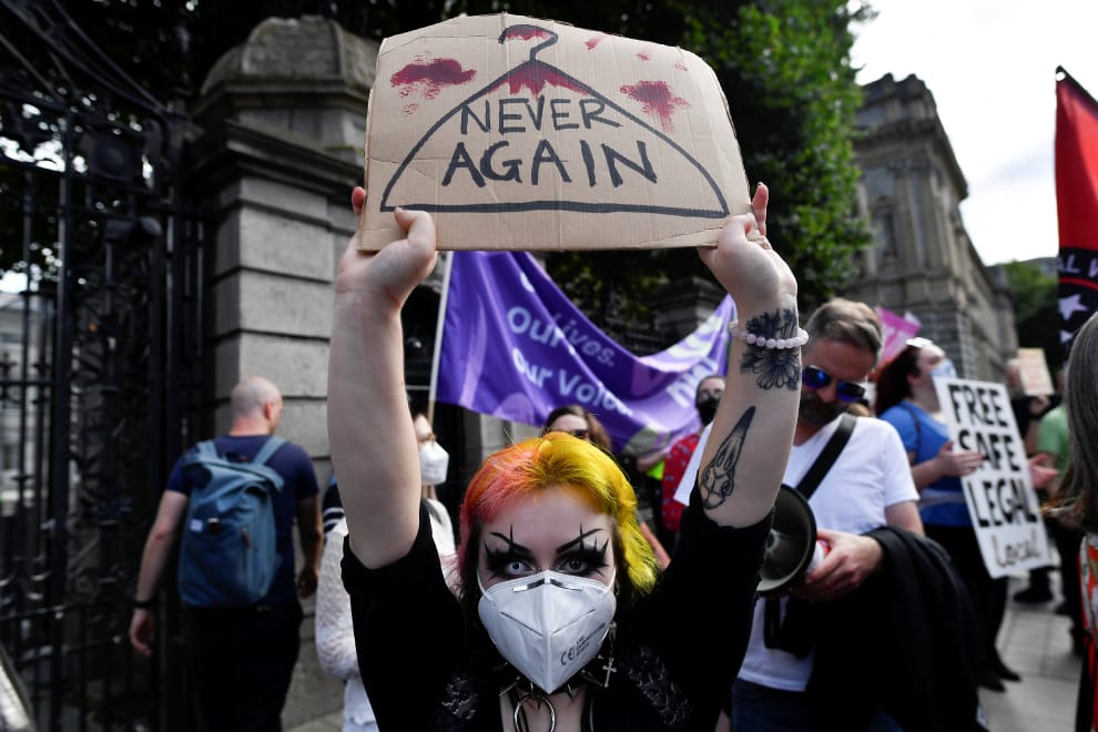 在首都都柏林街頭,支持女性墮胎權的民眾上街參加「為選擇遊行」(March for Choice)活動,在即將到來的墮胎法廢除審查前表達自己的心聲。其中,一名參與者高舉繪有染血衣架、寫著「別再來」字樣的紙板抗議。過去,有不少婦女在無法合法接受墮胎手術下,利用衣架替自己墮胎。