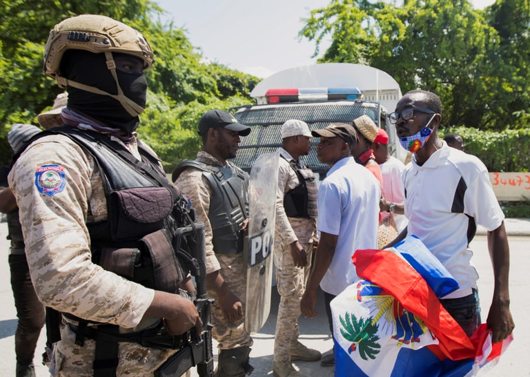 在位於太子港的美國駐海地大使館前,不滿海地移民被美國遣返的民眾特地來此抗議。