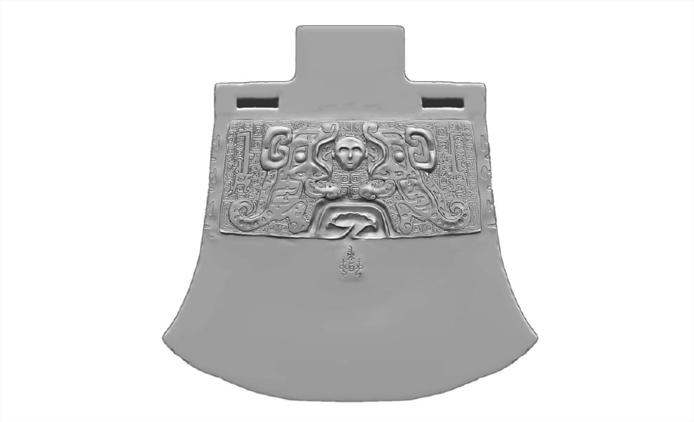 婦好墓曾出土大鉞(音同越)兩件,象徵著商代王后掌握極高的軍權。從考古資料來看,史書裡妲己被罵得滿頭包的「魅惑干政」、「牝雞司晨」之罪,很可能只是商代王后的日常權責。圖為策展團隊以 3D 建模復原出的大鉞。