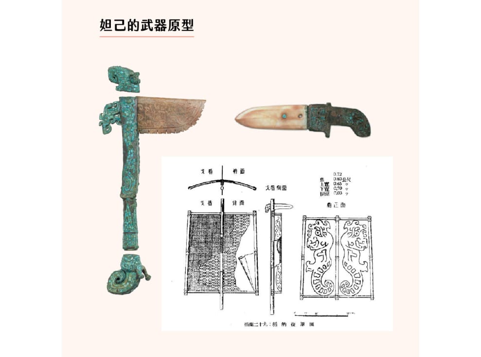美國弗利爾美術館收藏的商代玉戈(左圖)、小屯 331 號墓出土鑲嵌綠松石銅內玉戈(右上圖)、小屯殷墟出土楯(右下圖),都是妲己兵器配備的參考原型。