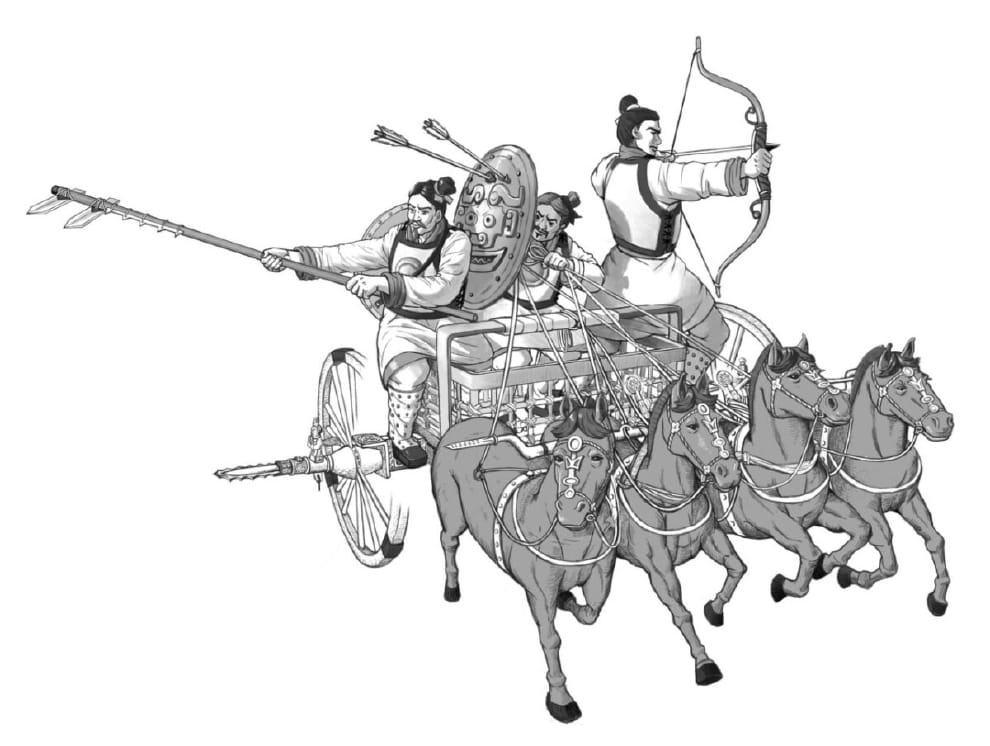 殷商時期馬車很稀少,推測是從歐亞草原傳入。死對頭周人從草原民族吸收造車技術,成為大戰時的秘密武器,在牧野之戰一舉擊潰商軍,就此揭開了車戰時代的序幕。圖為西周車戰示意圖。