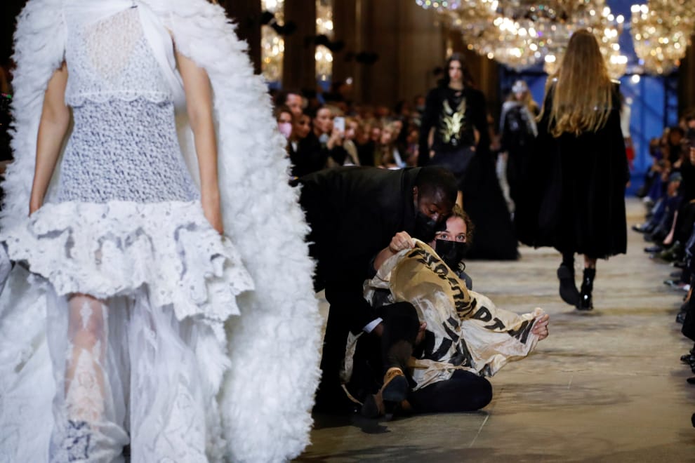 在巴黎,一名來自非營利環保及人權組織「地球之友—法國」(Friends of the Earth - France)的倡議人士,帶著寫上「過度消費=滅絕」(Overconsumption = Extinction)的布條,跑到了時裝周的LV大秀上進行抗議。
