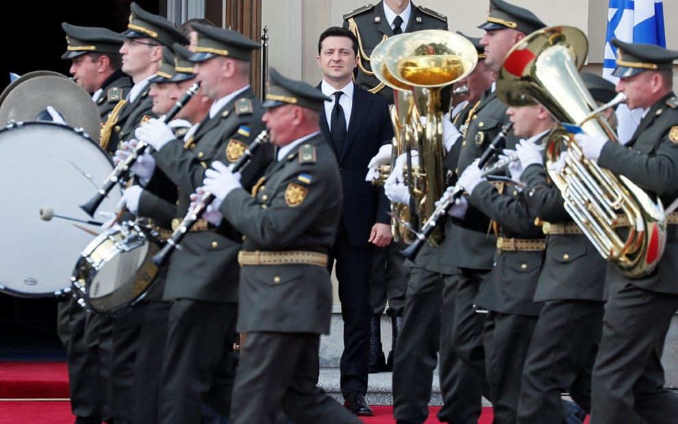 在首都基輔(Kyiv),以色列總統赫爾佐格來訪,烏克蘭總統澤倫斯基(Volodymyr Zelensky,圖中)出席了為他而舉辦的歡迎儀式。