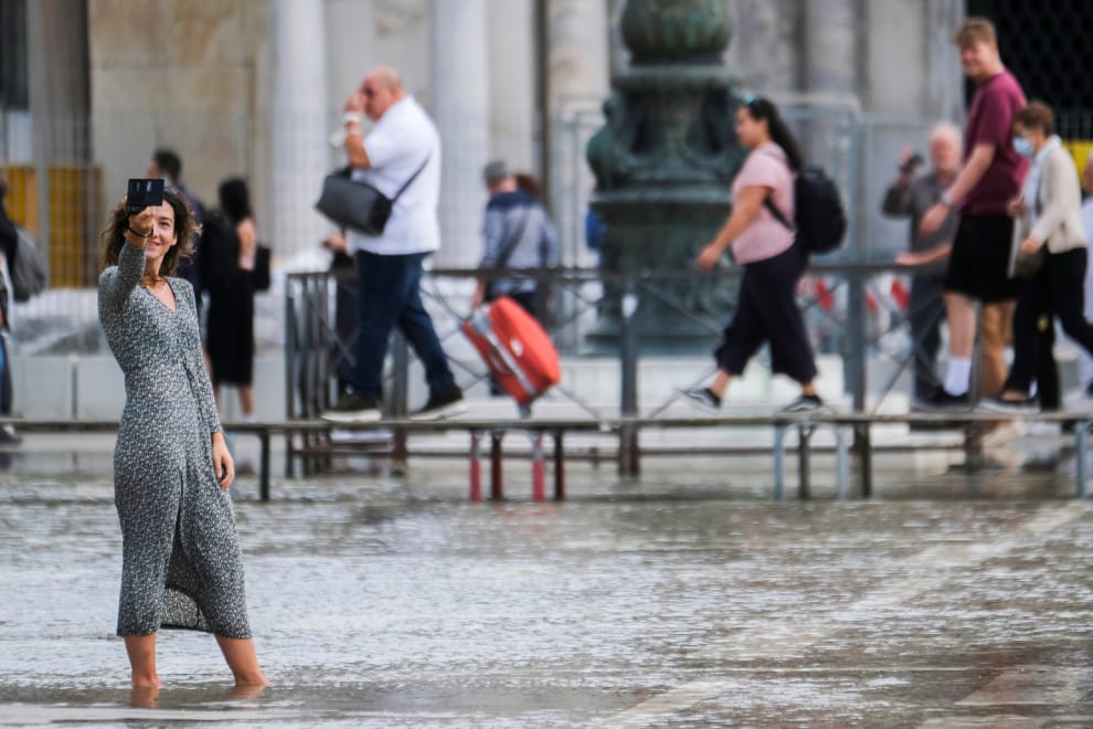 在威尼斯(Venice),一名女子悠哉地站在氾濫的聖馬可廣場(St. Mark's Square)中自拍。