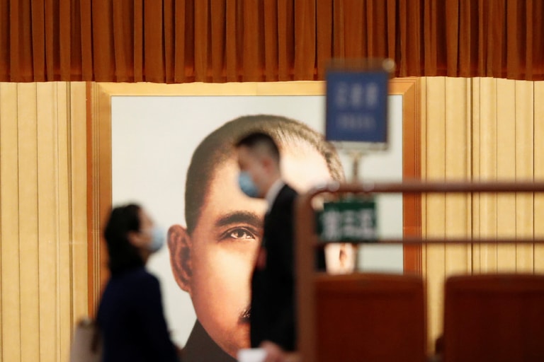 在中國首都北京人民大會堂的辛亥革命 110年慶祝典禮上,典禮現場掛起了一幅巨大的孫中山肖像。