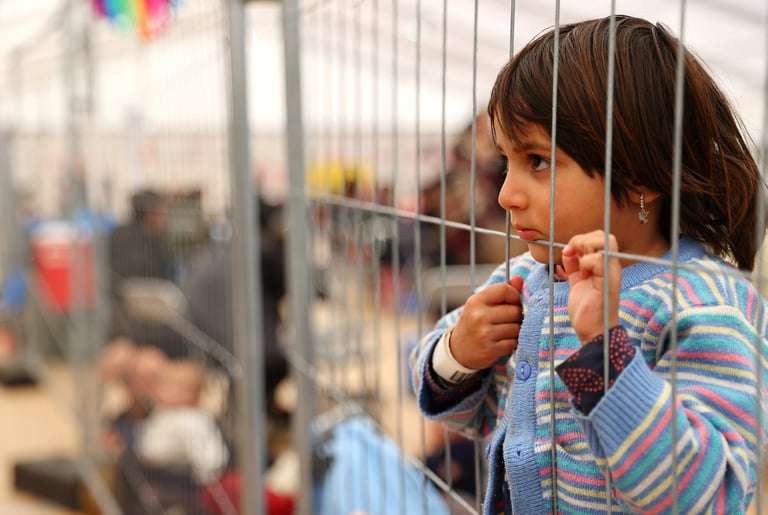 在德國中部的拉姆施泰因(Ramstein)美國空軍基地,一名剛自阿富汗被撤離的小女孩攀在鐵網上望著外邊,她和這裡的許多阿富汗移民一樣,都在等待民航機降落,載著他們飛往美國。