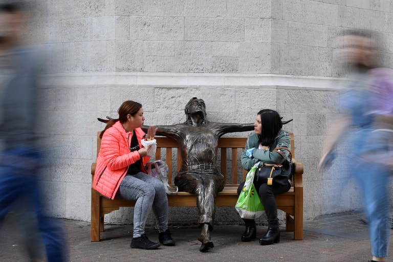 在英國首都倫敦的卡納比街(Carnaby Street),兩名女子坐在長椅上,端詳著坐在中間的披頭四樂團成員(The Beatles)約翰藍儂(John Lennon)雕像。這尊名為《想像》(Imagine)的作品,是雕刻家霍洛芬森(Lawrence Holofcener)雕來紀念約翰藍儂 81歲冥誕的致敬作品。