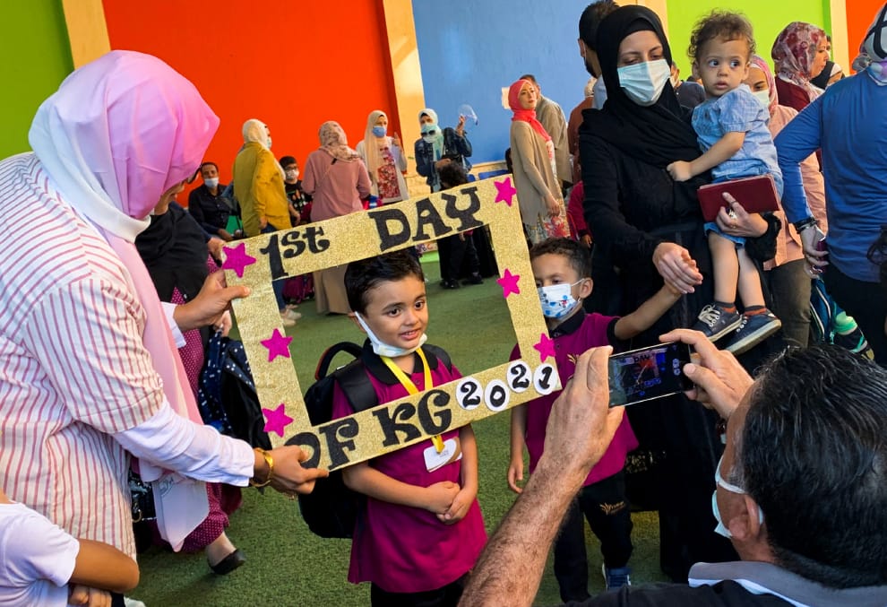 在埃及首都開羅郊區馬底區(Maadi)的特權語言學校(Privilege Language School),一名戴著口罩的家長拿起打卡框,替即將入學的兒子留下一張充滿意義的照片。