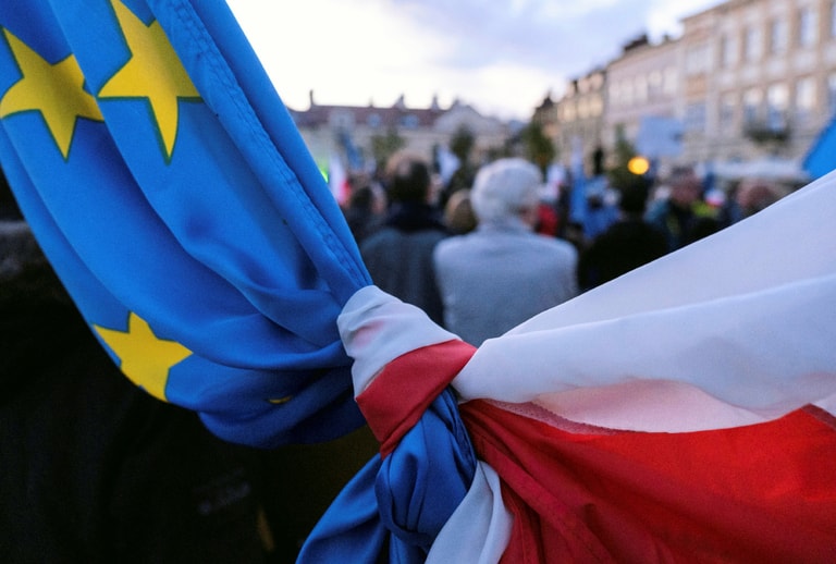 在波蘭東南部的熱舒夫市(Rzeszow),唯恐波蘭退出歐盟的民眾舉辦了一場示威活動,一些示威者們還將現場的兩面歐盟、波蘭國旗綁在一起打了個結,以示他們反對波蘭退出歐盟的訴求。