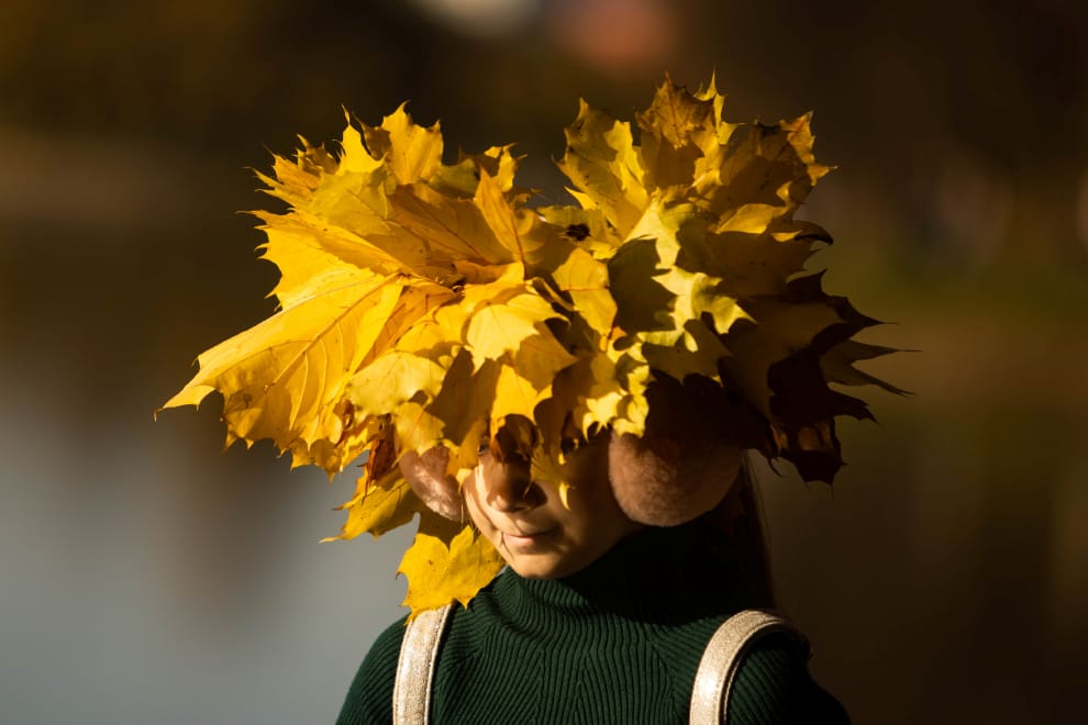 在俄國首都莫斯科,一名女子帶著一頂用轉黃的葉子做成的帽子,走在秋天的艷陽裡。