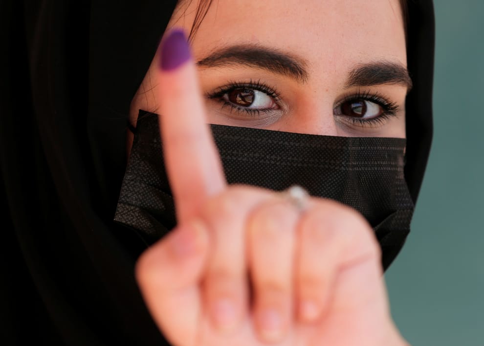 在伊拉克首都巴格達的一處投票站裡,一名女子在投完票後,朝著鏡頭秀出她已經染上墨水的食指。