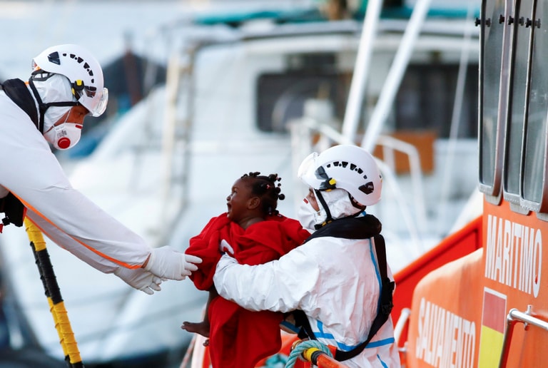 在西班牙大加納利群島(Gran Canaria)的阿爾基內金港(Arguineguín),船上的救難人員抱起一名孩子,將他遞給岸上的同僚。