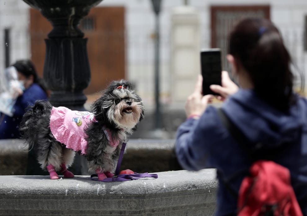 在秘魯首都利馬(Lima)的聖方濟各聖殿與修院(San Francisco church)外,一名女子正朝著一隻剛參加完天主教祝福儀式的狗狗拍照。