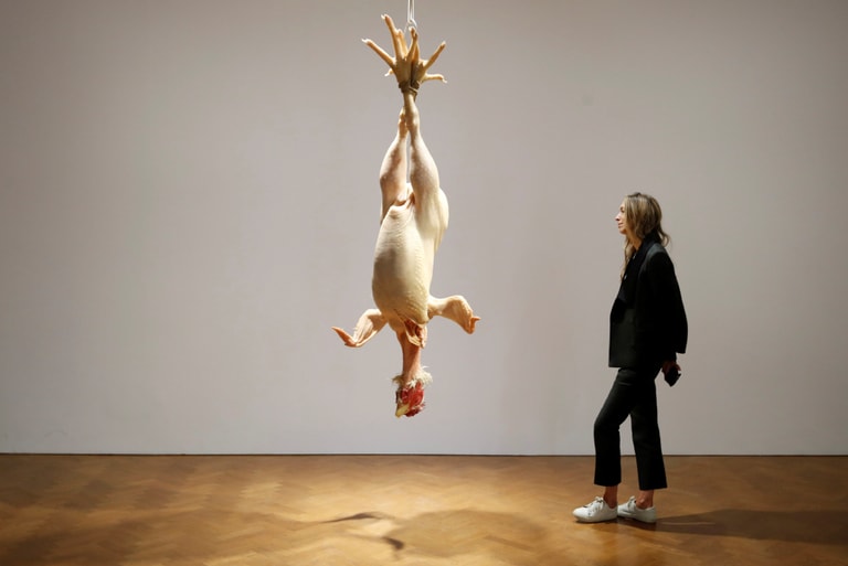 在英國首都倫敦的羅帕克藝廊(Thaddaeus Ropac gallery)裡,藝廊員工在澳洲藝術家穆克(Ron Mueck)的雕塑〈靜物畫〉(Still Life)停下腳步,凝神細看穆克的作品。