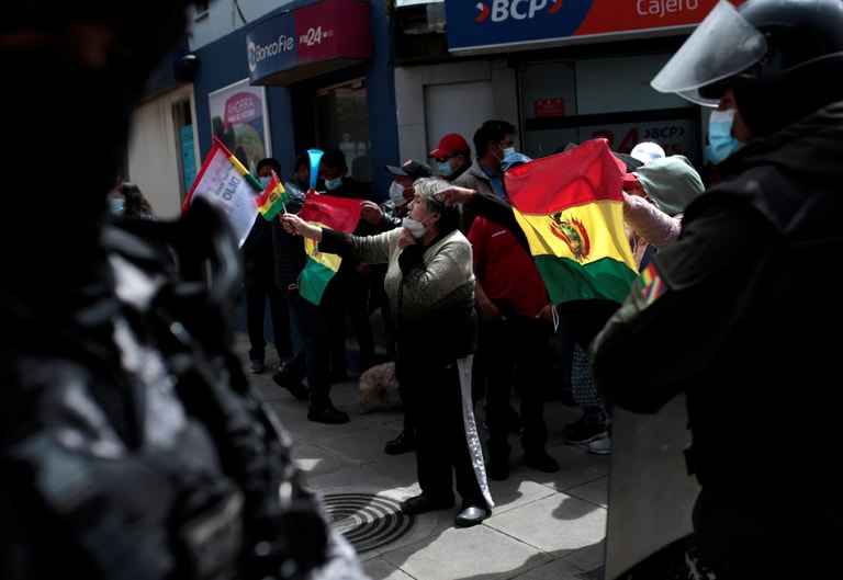 在玻利維亞首都拉巴斯(La Paz),一名反對玻利維亞總統阿斯(Luis Arce)的示威者在街上與警方起了口角。