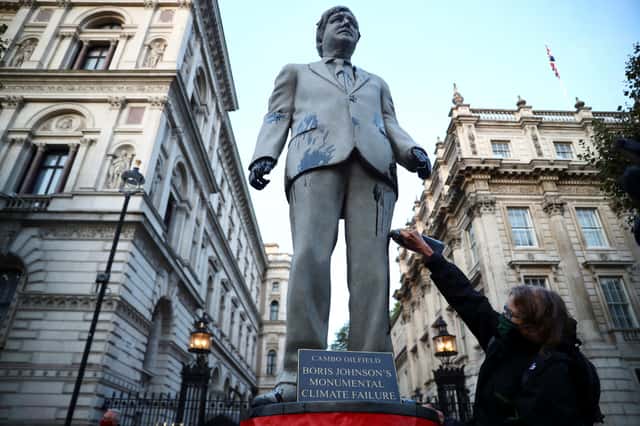 在英國首都倫敦的首相官邸外,綠色和平組織(Greenpeace)的成員在這裡立起了一尊英國首相強生(Boris Johnson)的雕像,並朝著他身上傾倒油汙,抗議他發放鑽探許可,允許石油公司開採位於英國北部謝德蘭群島(Shetland Islands)的坎博油田(Cambo oilfield)。