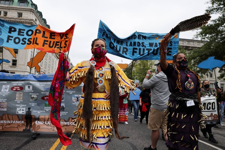 在華盛頓特區的白宮外,美國的原住民、環保人士在原住民日(Indigenous Peoples' Day)這天一起走上街頭,為環境發聲。