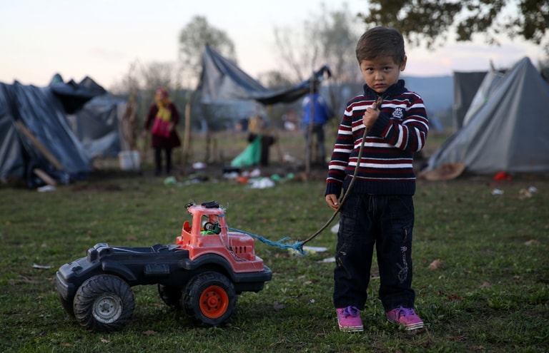 在波士尼亞與赫塞哥維納(Bosnia and Herzegovina)西北部的城市大克拉杜沙(Velika Kladuša)裡,一名來自阿富汗的孩子正在一座臨時的營地裡玩玩具。