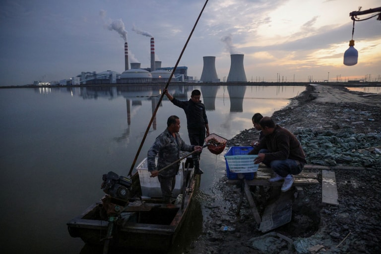 在中國天津市一間由中國國家開發投資公司投資的發電廠附近,漁民們正在湖畔忙著打漁。