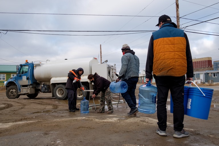 在加拿大努納武特省(Nunavut)首府伊魁特市(Iqaluit),市府員工尤納哈(Jackie Unahah)正在替市民們裝水,唯恐他們和伊奎特市的其他 7,000位市民不慎誤喝了可能已經遭到燃料污染的水。