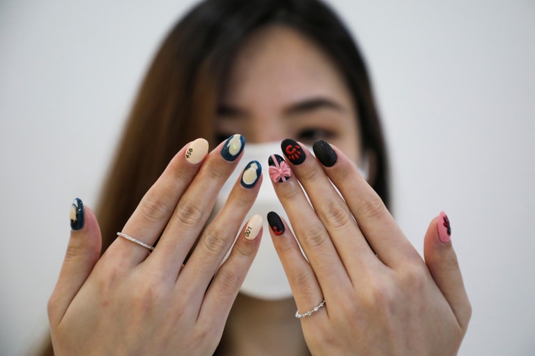 在馬來西亞首都吉隆坡(Kuala Lumpur)的一間美甲沙龍裡,美甲師以近期爆紅的影劇《魷魚遊戲》(Sauid Game)為靈感,替照片中的顧客彩繪指甲。