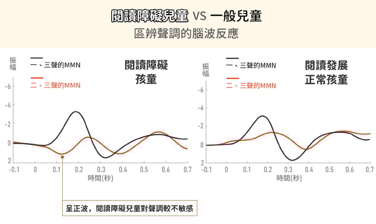 李佳穎研究發現,在一、二、三聲差異音比例為 0.1:0.1:0.8 的情況下,閱讀障礙的孩子 MMN 指標即出現問題──閱讀障礙孩子「前注意階段」的語音敏感度比較差。但如果是過動兒,MMN 指標跟一般孩子並無差異,主要是 P3a 出現問題──過動兒在「不自主的注意力引導階段」反應較差。