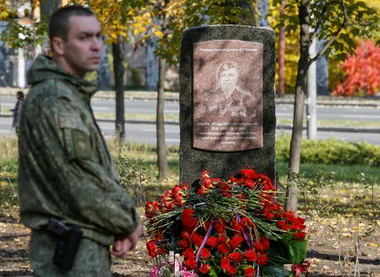 在烏克蘭東部的頓涅次克(Donetsk),一名士兵出席了頓涅次克人民共和國軍官帕夫洛夫(Arseny Pavlov)的紀念碑揭幕儀式。2016年,在烏克蘭分離主義者自立的政權中擔任軍官的他,於自家公寓中遭人以炸彈炸死。