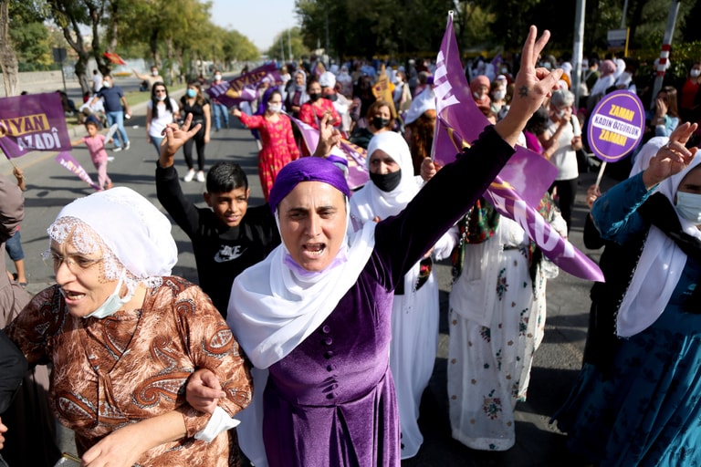 在土耳其東南部第一大城迪亞巴克爾(Diyarbakir),示威者們帶著標語走上街頭,抗議該國國內的種族主義、性別歧視及其他各式各樣的歧視問題。