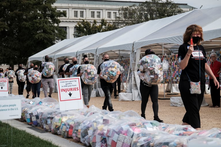 在華盛頓特區的國家廣場(National Mall),參與靈魂箱計劃(Soul Box Project)的志工們抱著一袋袋手折紙盒在會場內穿梭,為這場紀念死於槍下遇害者的展覽忙碌著。