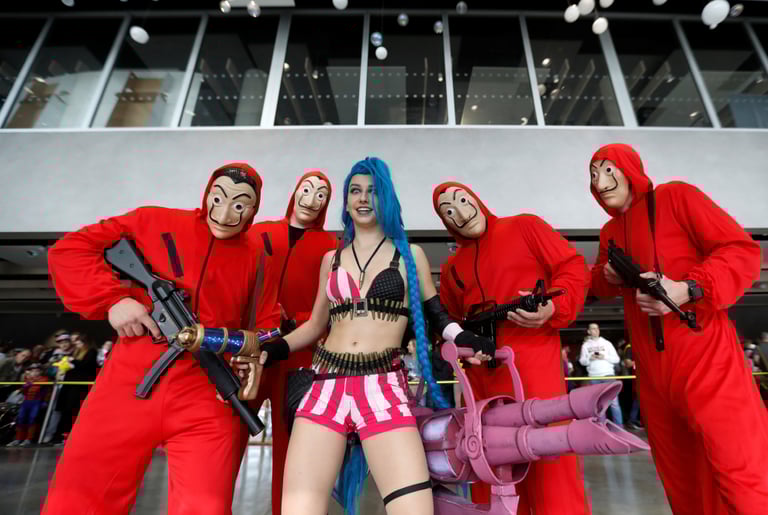 在捷克首都布拉格,影視愛好者們打扮成Netflix熱門影集《紙房子》(Paper House)角色的樣子,參加 2021年的布拉格動漫展(Prague Comic Con)。