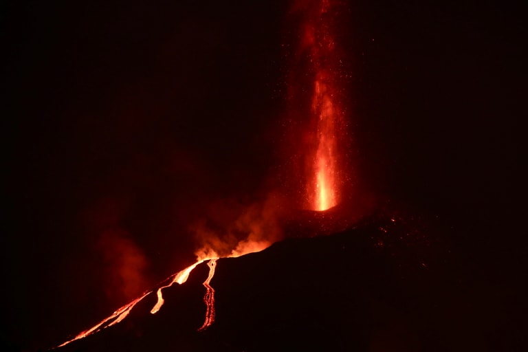 在西班牙加納利群島(Canary Island)的拉帕爾馬島(La Palma),老峰火山(Cumbre Vieja)依舊在持續噴發當中,深紅色的岩漿照亮了夜空。