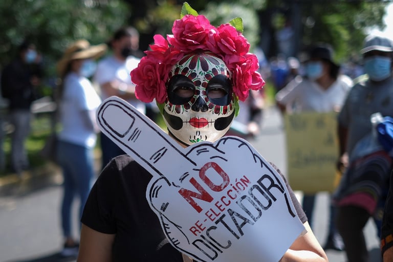 在薩爾瓦多首都聖薩爾瓦多市(San Salvador),一名示威者帶著一張寫著「獨裁者,別想重新當選」的標語走上街頭,抗議薩爾瓦多總統布格磊(Nayib Bukele)推動的一連串改革。如果這些改革順利上路,布格壘就可以無視選舉規定、二度挑戰連任總統。